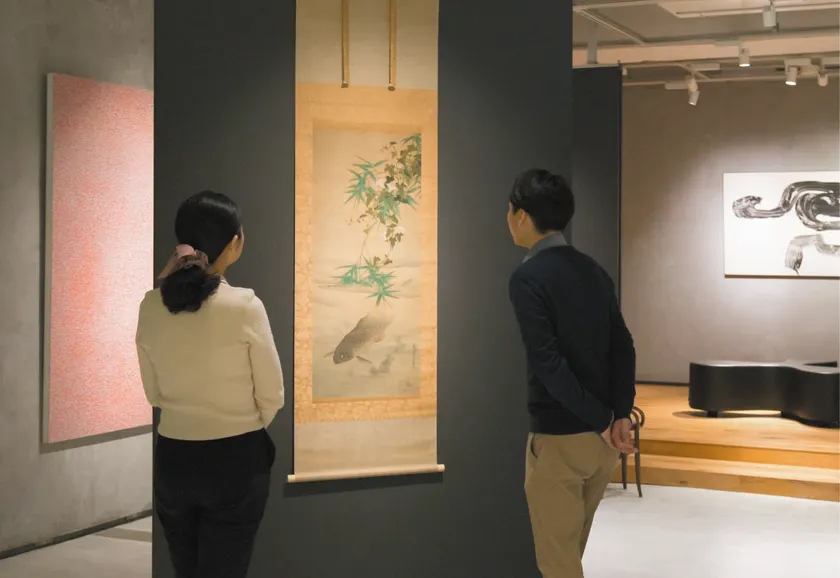 会期中は、加島美術にて出品作品をガラスケースなしで展示しております。「美祭 撰」でご紹介するのは、国内外の美術館の展示や収蔵品に加わる事もある、まさに美術館クオリティーの珠玉の作品ばかり。日本美術の巨匠たちの唯一無二の作品を、間近にご覧いただける貴重な機会です。作家の筆遣いや古美術品特有の経年美、紙や岩絵の具の質感までも、どうぞ心ゆくまでご鑑賞ください。