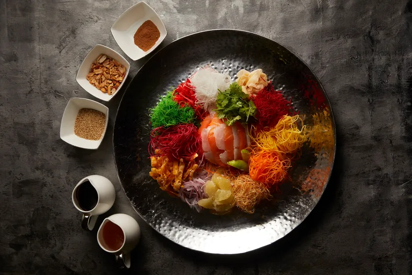 シンガポールやマレーシアでは、旧正月に縁起の良い料理としてイーサンを食べる文化があります。家族や友人と一緒に願い事をしながら、お箸で野菜の千切りを高く持ち上げ、具を混ぜ合わせてソースや薬味とともにいただくのが慣わしです。真鯛、サーモンの他に、コリアンダー、エシャロット、カブ、キュウリなど、色とりどりの具が混ざる東南アジアのエキゾチックな味を召し上がれ。