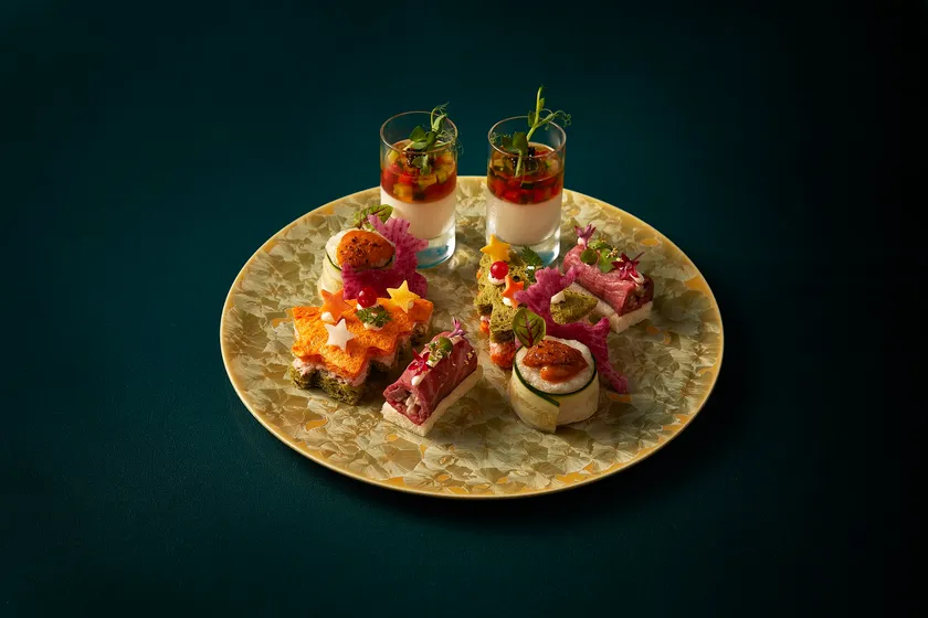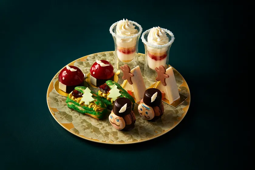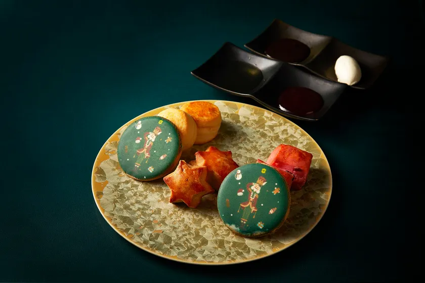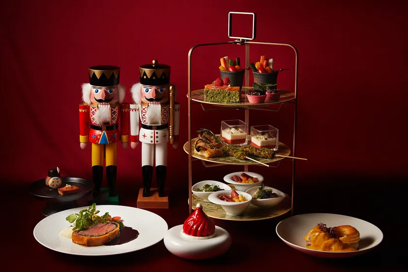 今年は世界のクリスマスケーキをテーマに、ショートケーキ、シュトーレン、エクレア、サンタクロースのムースなどのほか、今年の主役であるくるみ割り人形が描かれたマカロンがスイーツに登場。セイボリーは、クリスマスツリー形の楚蟹のサンドイッチ、雪に見立てた白いトマトコンソメを添えた帆立と雲丹の贅沢な逸品、コンソメジュレとキャビアを添えた旬のカリフラワーのムース、国産牛のローストビーフなど、クリスマスに相応しい豪華なラインアップに。クリスマスの鮮やかな色合いで、目でも楽しめるホリデーティータイムをご堪能ください。