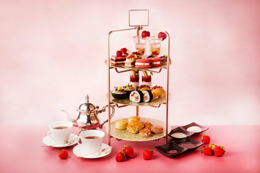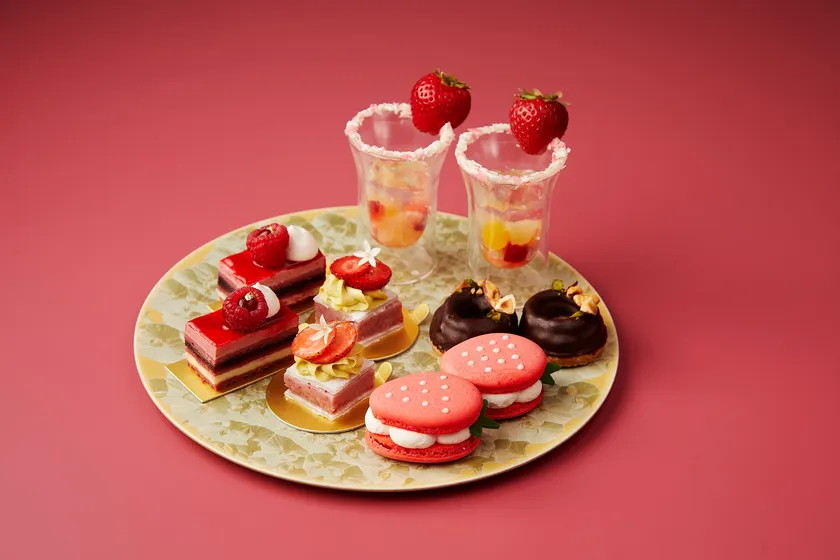 クリスマスの翌日からは、旬の苺をふんだんに使用した華やかなストロベリーアフタヌーンティーを提供いたします。赤とピンクが映えるスイーツには、洋風苺大福やマカロン、ミックスベリーオペラ、苺と文旦とみかんのマチェドニア、クロナッツを。セイボリーは、パースニップムースとトリュフ風味のビーツジュレ、ベーグルサンドイッチ、甘海老と菜の花のタルタル、ローストビーフと苺の洋風太巻きなど、バラエティ豊かな仕上がりとなっています。