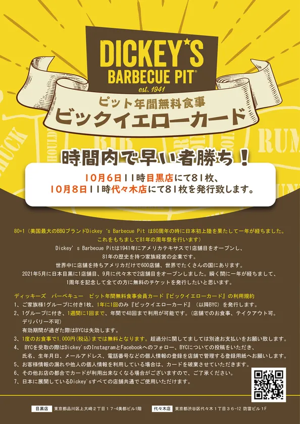 ディッキーズバーベキューピット日本上陸1周年 目黒店・代々木店にて81周年祭【80+1】を開催