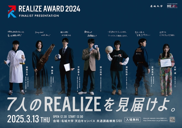 学校法人名城大学(名古屋市天白区)は、2026年の開学100周年を記念して、学生が入学してから夢に向かって挑戦した取り組みを発表するプレゼンテーション大会「REALIZE AWARD 2024」を開催します。昨年に引き続き2回目の開催で、名城大学と名城大学附属高等学校の他、本法人が指定管理法人を務める愛知総合工科高等学校専攻科の学生・生徒から応募を募り、52人がエントリー。書類選考を経てファイナリスト7人を決定し、3月13日(木)にプレゼンテーションします。