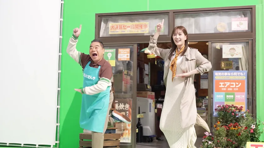 今回のTVCMは二人の情緒的な演技と、古き良きまちの電気屋さんを再現したセットが相まって、懐かしい日本映画のワンシーンのような雰囲気に仕上がっています。二人の再会シーンの撮影で、本田さんとの再会に驚きつつも喜びを隠せない…という複雑な心情を、絶妙な表情とセリフで完璧に表現する出川さん。普段の出川さんの雰囲気からは想像できないような表情に引き込まれました。その後、本田さんが出川さんをダンスに誘うシーンの撮影では、本田さんのロマンチックな所作と、それまでのしっとりした演技から一転した本田さんのとびっきりの笑顔に思わずうっとり…。シーンに合わせて表情やセリフを切り替える二人の演技にスタッフ一同脱帽でした。