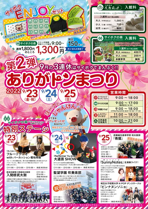 豚の育種から、精肉、ハム・ウインナーの製造・販売まで完全一貫体制で手がけている株式会社埼玉種畜牧場・サイボク(本社:埼玉県日高市、代表取締役社長:笹崎 浩一)がお客様感謝祭として「ありがトンまつり」を2022年9月23日(金・祝)~9月25日(日)に開催いたします。園内では楽しい「ステージイベント」のほか「ショッピング」「グルメ」「日帰り天然温泉」「アスレチック」などがあり、家族みんなで一日中楽しめる複合施設になっております。
