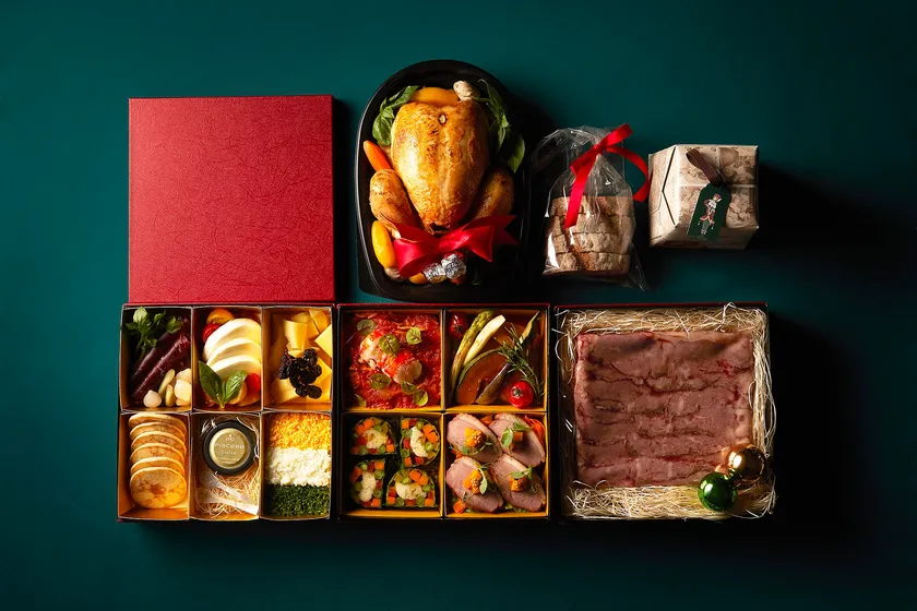 ご自宅の食卓で、贅沢なホテルのクリスマスディナーをお楽しみいただけるテイクアウトボックスには、キャビアやロブスターラザニア、ビーフの生ハム、冬野菜などの前菜が彩り豊かに敷き詰められ、メインは、若鶏のローストまたは横濱ビーフのローストからどちらかをお選びいただけます。ご家族やご友人と、心温まるホームパーティーをご堪能ください。