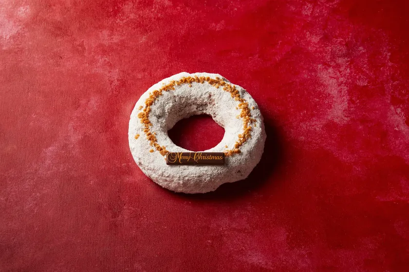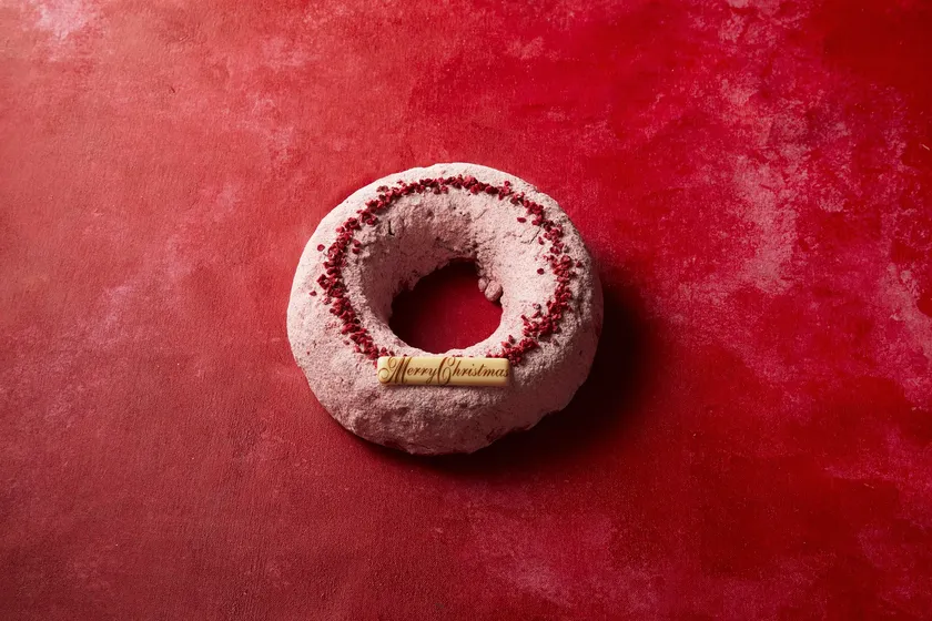 美しい真っ赤なリースを連想させるムースケーキは、チョコレートムース、オレンジクリーム、スパイス香るパンデピス、アプリコットやいちじくなどじっくりと煮たミックスドライフルーツ、スポンジ、プラリネガナッシュ、塩味のきいたヘーゼルナッツクランブルを合わせた、奥深く変化する味わいと食感をお愉しみいただける、特別なクリスマスムードにぴったりの逸品です。