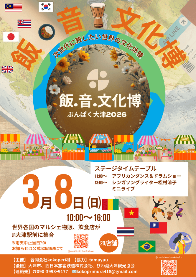 合同会社kokoperi村(滋賀県大津市、代表:村田邦子)は、2026年3月8日(日)、JR大津駅前広場にて、世界各国の食・音楽・工芸を通じて多文化共生への理解を深めるイベント「飯・音・文化博(ぶんぱく大津2026)」を初開催します 。