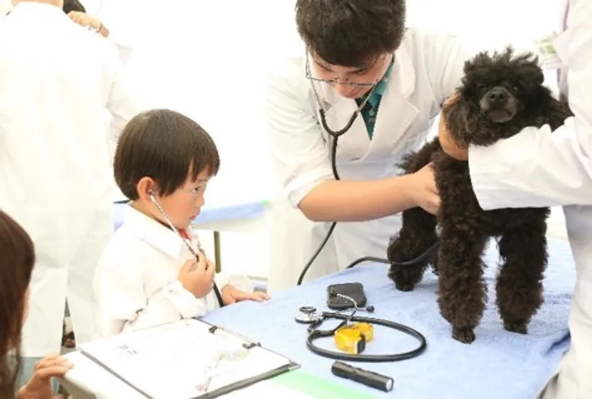 白衣を着て、聴診器でペットの心音を聞く等、獣医師のお仕事を体験することができます。