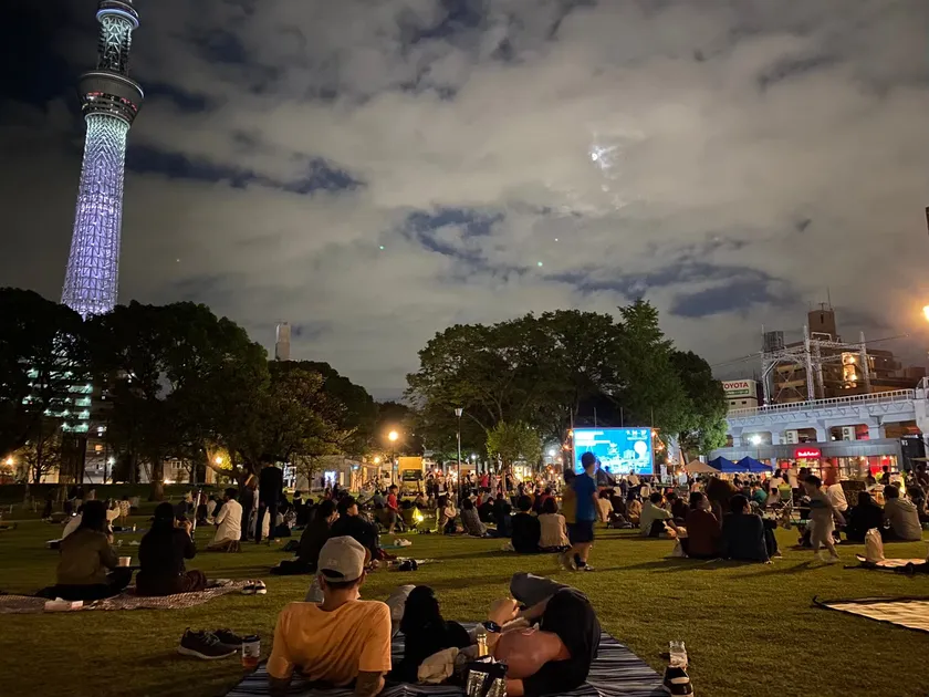 中秋の夜空に下、スカイツリーと浅草の間にある隅田公園に新しくできた広場と芝生を活用して、映画上映イベントができないかと初開催したのが前回2020年9月です。