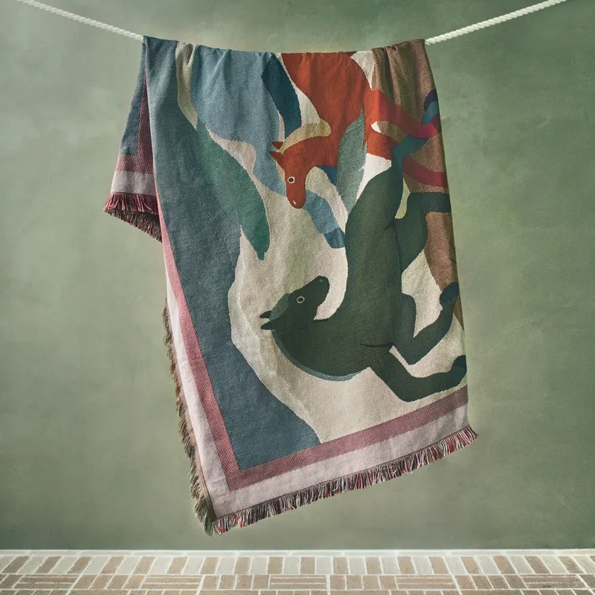 多色使いのゴブラン織りで色の濃淡を表現。3頭の馬が広大な草原でじゃれ合っているような躍動感のあるデザインに。ソファに掛けたり、壁に吊るしてもお部屋のポイントになります。