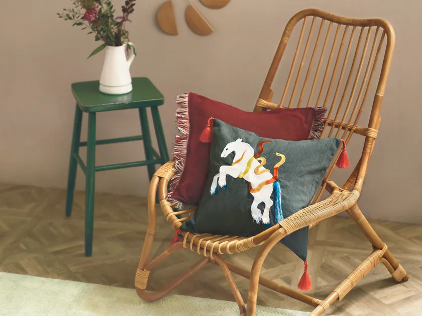 在メキシコ日本国大使館の壁画制作の他、近年は刺繍作品なども手掛けマルチに活躍するSCHOKO TANAKAさん。今回のコラボではSCHOKO TANAKAさんが普段からモチーフとして描いている馬やヘビ、カラフルな花などをインテリアアイテムに取り入れました。