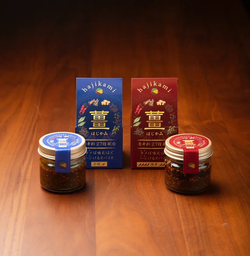 2021年1月に発売を開始した新感覚調味料【薑(はじかみ)】は、カリッとスパイスが弾ける感覚が新しい当店オリジナルのスパイス調味料です。【薑(はじかみ)】は、誰でも食べられる優しい辛さの【芳醇】と、辛い物が大好きな激辛狂をも満足させる【激辛】の2種類をご用意しています。オンラインショップと金沢本店の入ったビルの1階にある、北陸の魅力を集めたギフトショップ「[g]ift(ギフト)」にてご購入いただけます。構想から2年以上をかけ完成した、店主の渾身作【薑(はじかみ)】。新感覚調味料【薑(はじかみ)】をかければ、どんなカレーも専門店で食べるような本格スパイスカレーへと変身します。定期便の初回注文時には、【芳醇】1瓶をもれなくプレゼントしています。