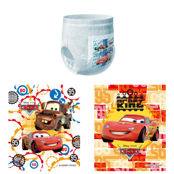 男の子用は“カーズ”、女の子用は“ディズニープリンセス”のデザインをそれぞれ採用。紙おむつ自体のデザインも男の子用と女の子用それぞれ3種類あり、デザインを選んで頂くことで、楽しく進んではいて頂けます。