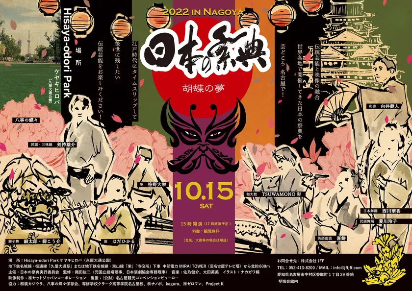 この度、株式会社JFFでは、新しい名古屋の文化観光コンテンツ創出を目指し、来たる10月15日(土)久屋大通公園の北端ケヤキヒロバにおいて、「日本の祭典2022 in Nagoya 胡蝶の夢」を企画公演いたします。
