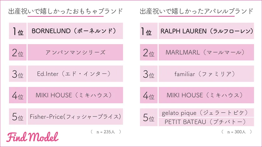また、出産祝いでもらって嬉しかったアパレルブランドの1位は【RALPH LAUREN(ラルフローレン)】となりました。同ブランドにおいては特にロンパースを上げる方が多く、インスタグラマーの中でももらって嬉しいアイテムであることもわかりました。