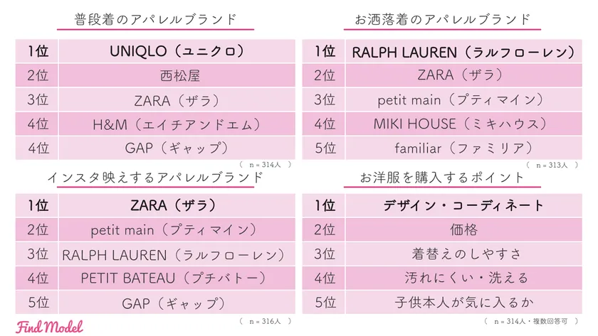 またお洒落着として人気のブランドは【RALPH LAUREN(ラルフローレン)】が1位となり、【ZARA(ザラ)】、【petit main(プティマイン)】が続けて2、3位となりました。