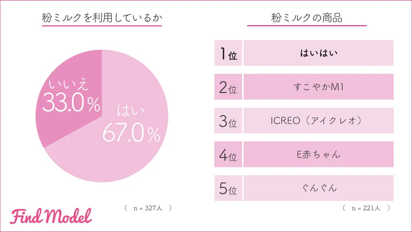 お子様に粉ミルクを飲ませているかというアンケートに対して【はい:67.0%】と過半数以上が粉ミルクを飲ませていることがわかりました。
