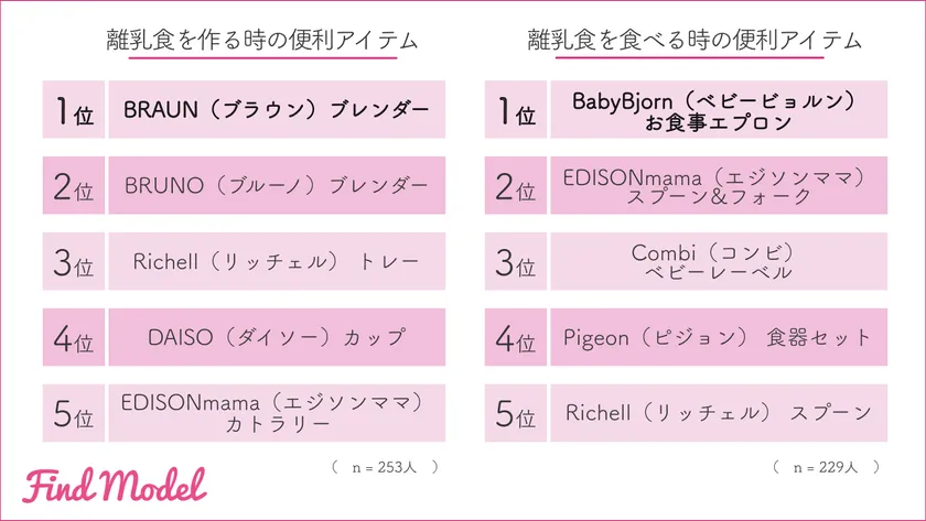 お子様のごはんを作るうえで便利なアイテムは【BRAUN(ブラウン)のブレンダー】が1位となりました。続けて2位は【BRUNO(ブルーノ)ブレンダー】となり、ブレンダーは離乳食を作るうえで必須アイテムとなっているようです。