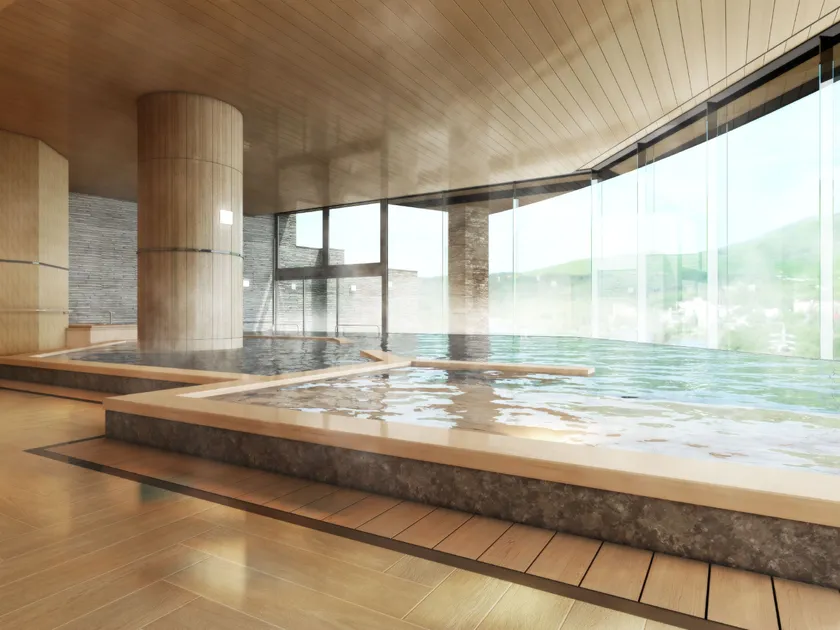 湖天の湯では、温浴・スパ・サウナから見下ろす白樺湖や車山・霧ヶ峰に身体が溶け込む様な時間をお過ごし頂けます。