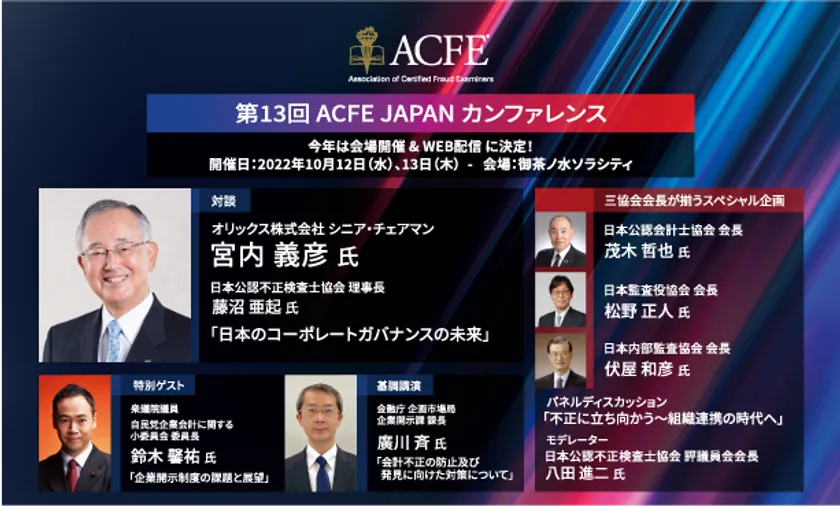 国内唯一の不正対策教育の専門機関である一般社団法人 日本公認不正検査士協会(所在地:東京都千代田区、理事長:藤沼 亜起、以下 ACFE JAPAN)は、2022年10月12日(水)、13日(木)の2日間にわたって第13回 ACFE JAPAN カンファレンスを開催します。