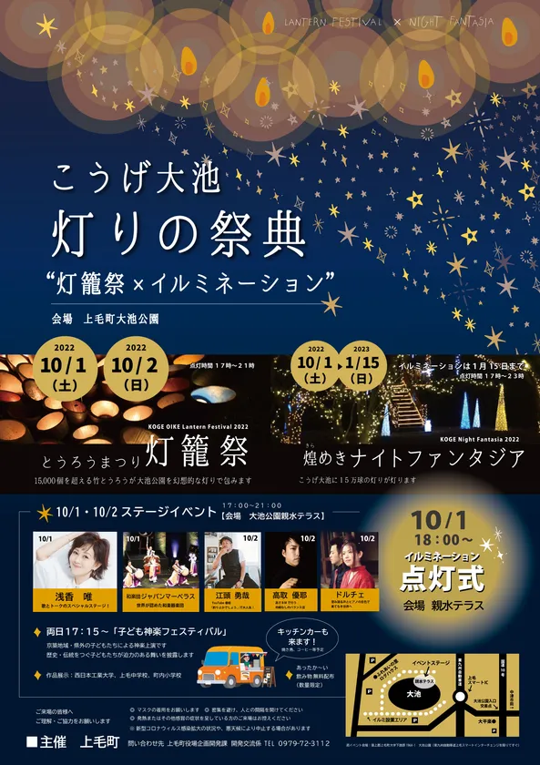 イベント企画を行うMIX JUICE株式会社(所在地:大分県中津市、代表取締役:中村康範)は、上毛町より委託を受け、上毛町の四季が織りなす自然の美しさや多様性を表現し、上毛町が掲げる『みんなが輝くまち上毛』の実現に寄与するイベント『こうげ大池 灯りの祭典』を10月1日~2日に福岡県築上郡上毛町の上毛大池公園で行います。