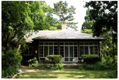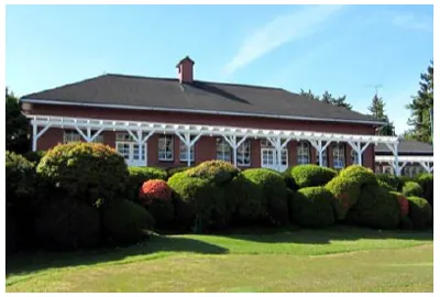 六甲山の開祖、英国人貿易商のアーサー・ヘスケス・グルームが日本で最初のゴルフ場として1903(明治36)年5月に開業した「神戸ゴルフ倶楽部」のクラブハウス。一面のガラス窓と下見板の朱と黒の大きな寄棟屋根のコントラストが美しい。