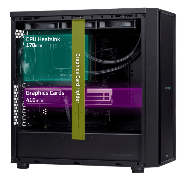 広々とした内部構造は最大410mmのグラフィックスカードを搭載可能とし、グラフィックスカードホルダーでしっかり支えることでズレや脱落を防止します。