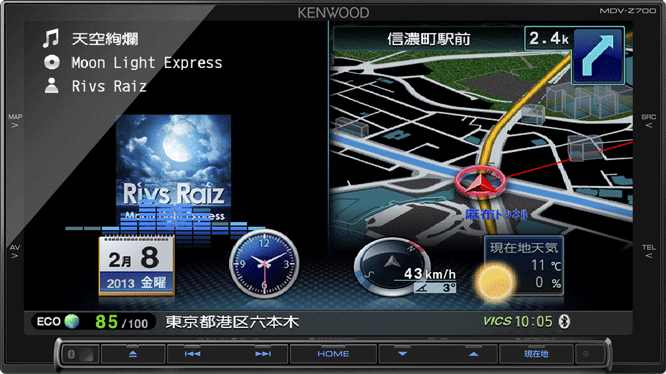 「MDV-Z700」今回の採用にあたり、イラプションSTの特徴である、GPU(*)による高速な3Dグラフィックス描画処理をリアルタイムに最大限利用し、表現力の豊かなHMI(*)として3Dグラフィックスを活用することで、従来の高速レスポンスを維持しつつ、UIのリッチ化および高速描画処理の実現に貢献しております。