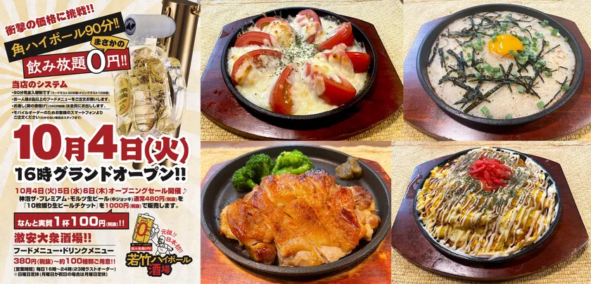 神奈川県内に14店舗、都内に1店舗を展開する外食企業、株式会社若竹(所在地:神奈川県横浜市、代表取締役:田口 優英)は、新店舗「若竹ハイボール酒場 鶴見西口店」を10月4日(火)にオープン致します。全席にハイボールタワーを設置して、自分で注ぐ角ハイボールの飲み放題(90分)を、なんとまさかの0円!完全無料サービスするという日本初の太っ腹な新業態です(*)。また「神泡ザ・プレミアム・モルツ」(中ジョッキ、通常の提供価格528円)のビールチケット(10枚綴り)を、10月4日(火)・5日(水)・6日(木)の3日間だけ、なんと1,100円で特別販売。実質ビール1杯が110円の破格の価格になってしまう超!お得なオープニングセールも開催致します。(*自社調べ)