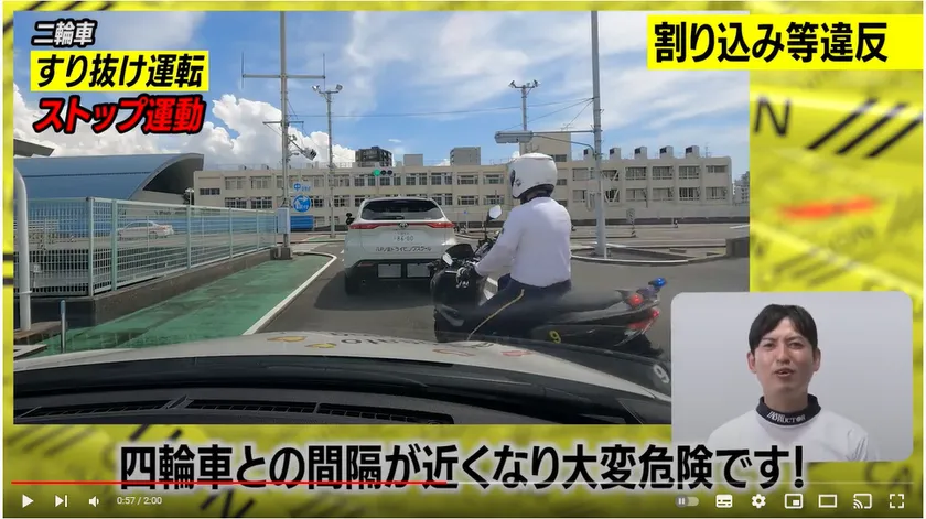 二輪車が、停止中や走行中の車両等の側方を通過するもののうち、道路交通法に抵触する様態を「すり抜け運転」といいます。近年、二輪車の交通事故が大幅に増加している背景を受け、道路交通法に違反した運転方法を動画で紹介しています。撮影はヤエドラの教習所内のコースで実施。実際に起きている危険運転を再現し、警察官による正しいルールの解説と、インストラクターからは危険な理由を丁寧に解説しています。