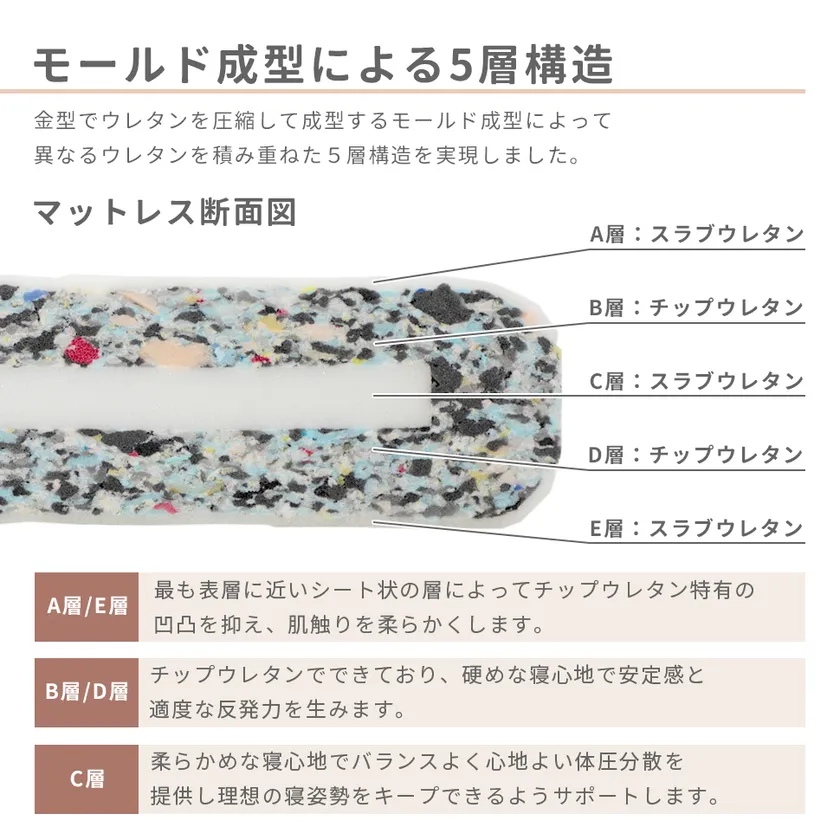 モールド成型を強みとするセルタンの技術が可能にした5層構造。スラブウレタンとモールドウレタンを積み重ねることで寝返りを打ちやすい高反発マットレスを実現しました。