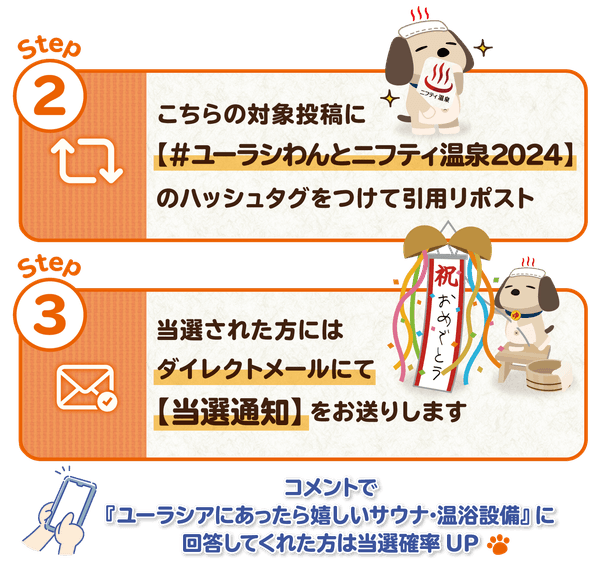 ②キャンペーン投稿に指定ハッシュタグ『 #ユーラシわんとニフティ温泉2024 』をつけて引用リポスト