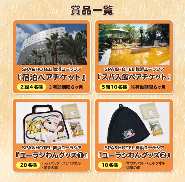 どなたでも使いやすいデザインのユーラシわんグッズや宿泊ペアチケットなどが抽選で当たるプレゼントキャンペーンです。