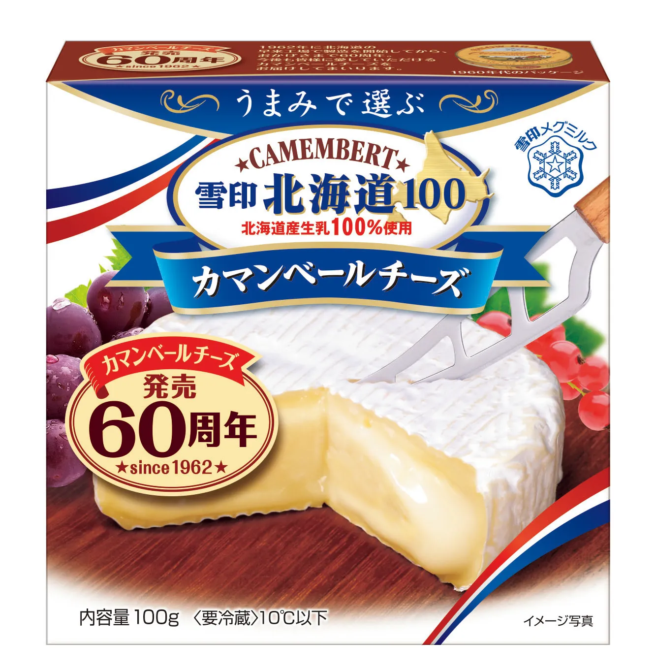 おかげさまで『雪印北海道100 カマンベールチーズ』は1962(昭和37)年の発売から60周年を迎えました。「日本人の味覚に合う」をコンセプトに築き上げた製造技術により、自社で培養した唯一無二の白カビと北海道産の生乳を100%使用して、トラディショナル製法※1で製造しています。