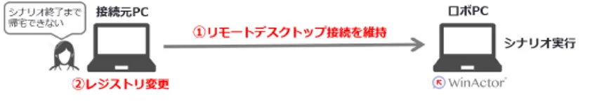 (2) リモート接続でシナリオ実行する際に、リモートデスクトップ接続のウインドウ最小化によるエラー回避策としてレジストリの変更が必要となります。しかし、レジストリ変更を禁止している企業も少なくありません。