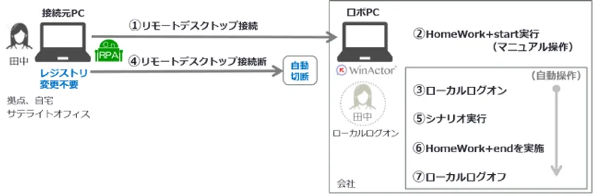 今回発表の「HomeWork+ライブラリ」は、リモート接続したロボPC*で実行することで、自動的にロボPCにローカルログオンされシナリオ実行できるライブラリとなります。このため、これまでのようにシナリオ終了までリモート接続を維持する必要がなくなり、レジストリ変更も不要となります。