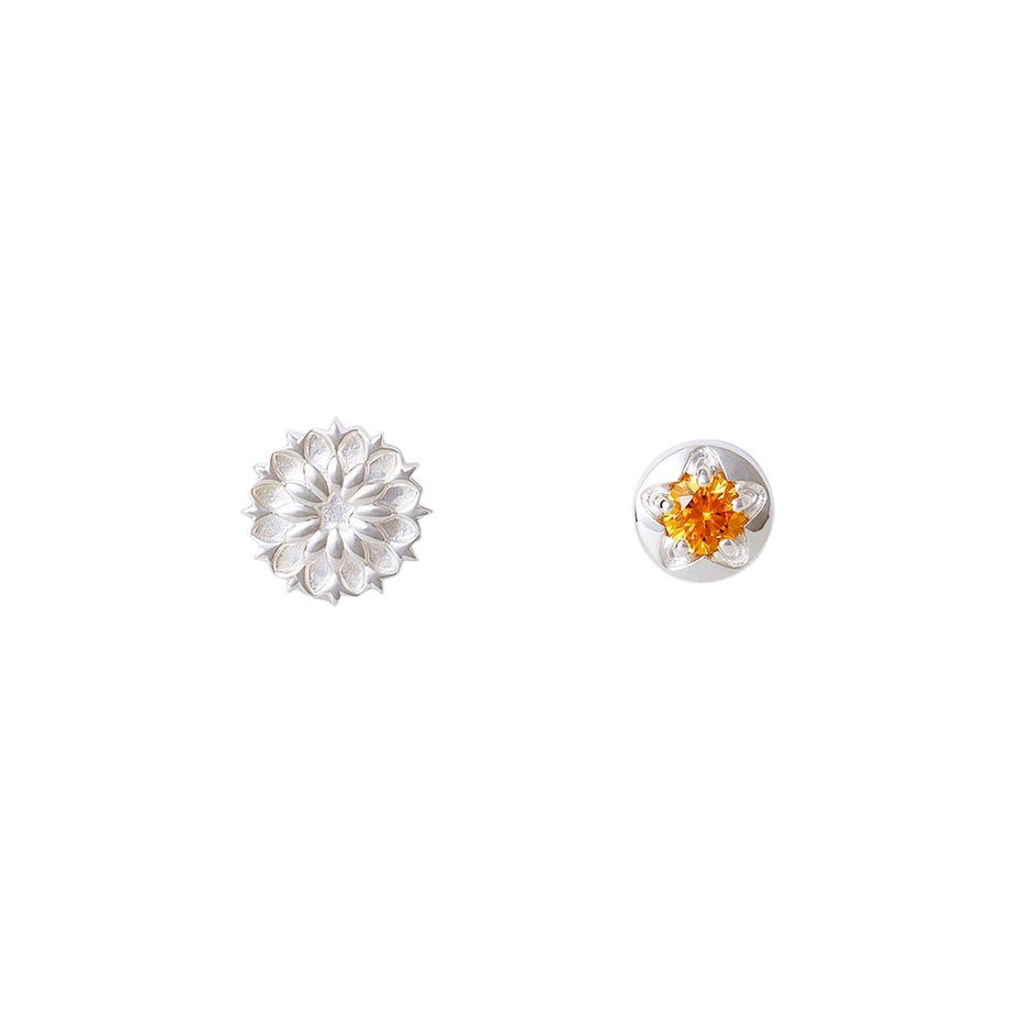 片方はひまわりの花のモチーフ、もう一方はイメージカラーストーンをセットした一粒タイプのアシンメトリーなデザイン。