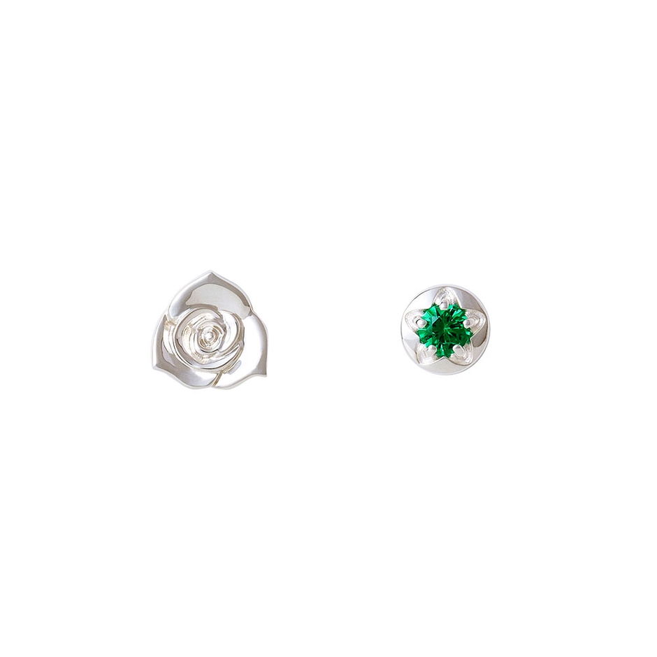 片方はバラの花のモチーフ、もう一方はイメージカラーストーンをセットした一粒タイプのアシンメトリーなデザイン。