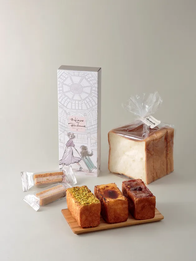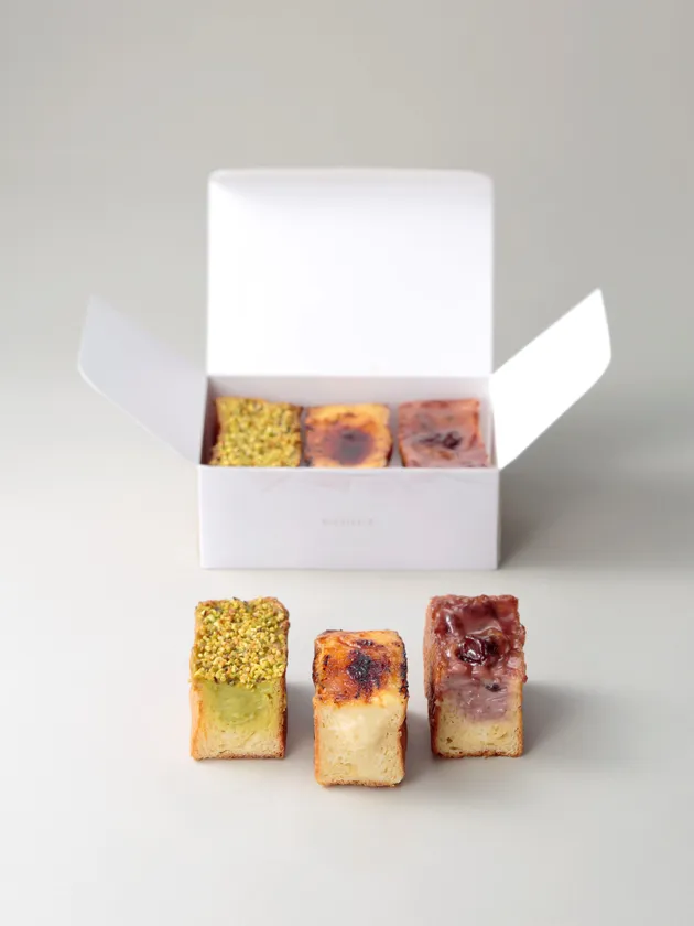東京駅 丸の内駅舎の壁面に使われているレンガをイメージした、四角い形のブリオッシュクリームパン。イチオシの「カスタード」は、ブリオッシュ生地の中にとろっと濃厚な味わいのカスタードを入れ、ブリュレ風に仕上げています。その他、赤ワインクリーム、ピスターシュ3種類の味わいを丸の内駅舎復原10年を記念したオリジナル箱に詰め合わせいたしました。