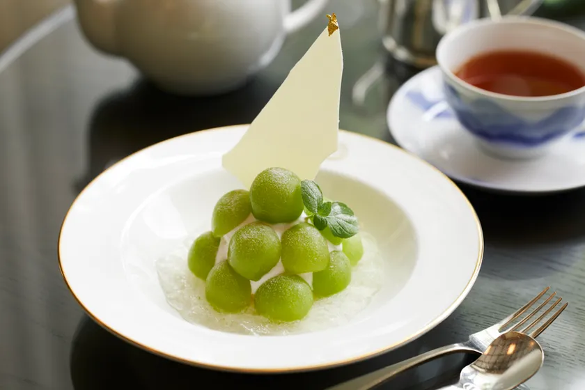 ギリシャヨーグルトのソルベにホイップクリームと大粒のシャインマスカットをいっぱいにデコレーションした贅沢な一品です。周りにデラウェア(白ワインの原料に多く使われる小粒で赤紫の葡萄品種)ワインのジュレを添え、葡萄の風味をより強く感じていただける仕上がりとなっています。