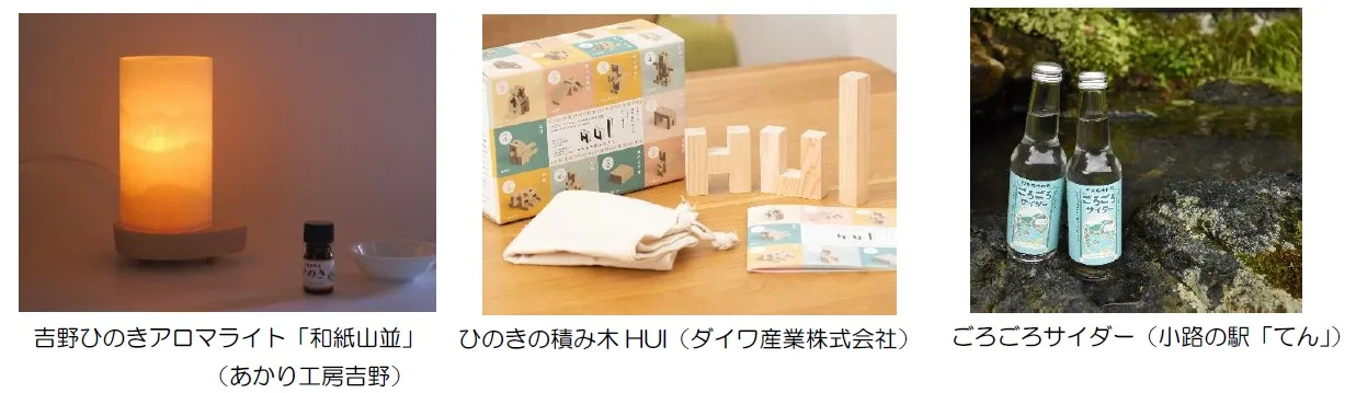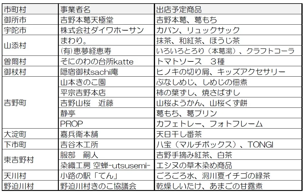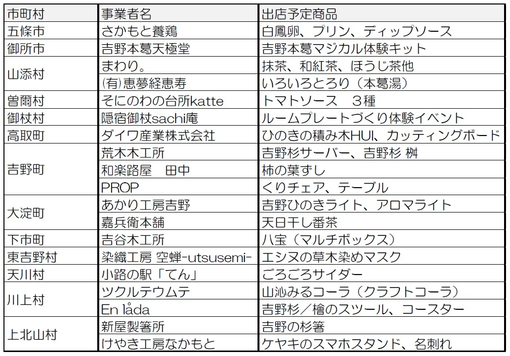 2階ウエルカムガレリアにて、名産の吉野杉や吉野ヒノキを使った木工製品や、地元の食品、食材、飲料等を販売し、あわせて同地域のPRを行います。