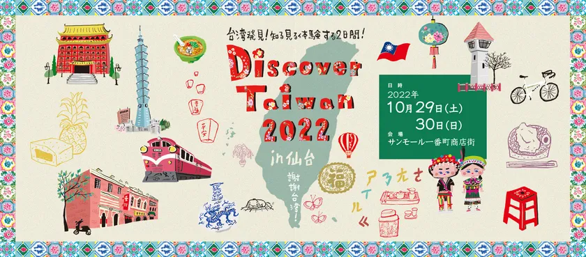 Discover Taiwan実行委員会は、台湾の文化や交流の歴史を伝えることに特化した台湾文化発信イベント【Discover Taiwan 2022 in 仙台】を2022年10月29日(土)、30日(日)に仙台の商店街アーケードにて開催し、震災後の台湾からのサポートや日本から台湾に送られたワクチンへの感謝を紹介することで日台交流を活性化するとともに、台湾で仙台文化発信イベントを開催することで相互理解を深めます。