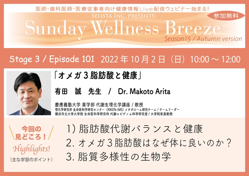 セリスタ株式会社(東京都千代田区、代表取締役:伊藤 承正)は、2022年10月2日(日)に、有田 誠先生(慶應義塾大学 薬学部 代謝生理化学講座/教授、理化学研究所 生命医科学研究センター(RIKEN-IMS)メタボローム研究チーム/チームリーダー、横浜市立大学大学院 生命医科学研究科 代謝エピゲノム科学研究室/大学院客員教授)を講師に迎え、医師・歯科医師・薬剤師・医療従事者限定無料Zoomオンラインセミナー『オメガ3脂肪酸と健康』を開催します。