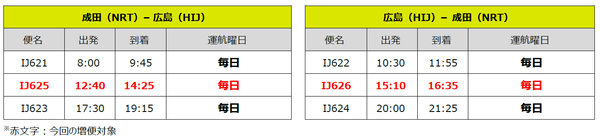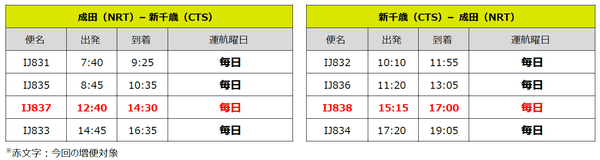 スプリング・ジャパン株式会社(本社:千葉県成田市、代表取締役社長:米澤 章、以下:スプリング・ジャパン)は2022年10月30日~12月31日の期間において、成田=新千歳線、広島線を以下の通り増便いたします。