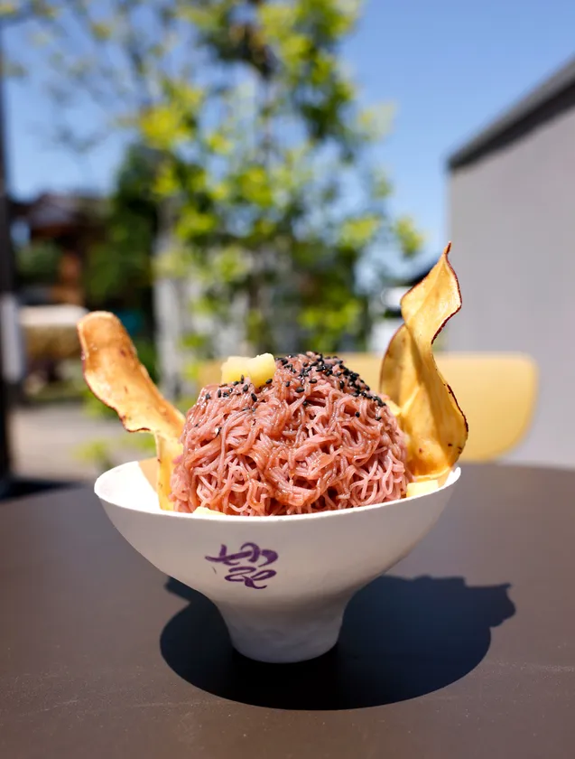 揚げたてのお芋チップス(通称:あげち)も、合わせてご提供いたします!搾りたて贅沢紫いもんぶらん、できたてチップスをその場でお召し上がりください!