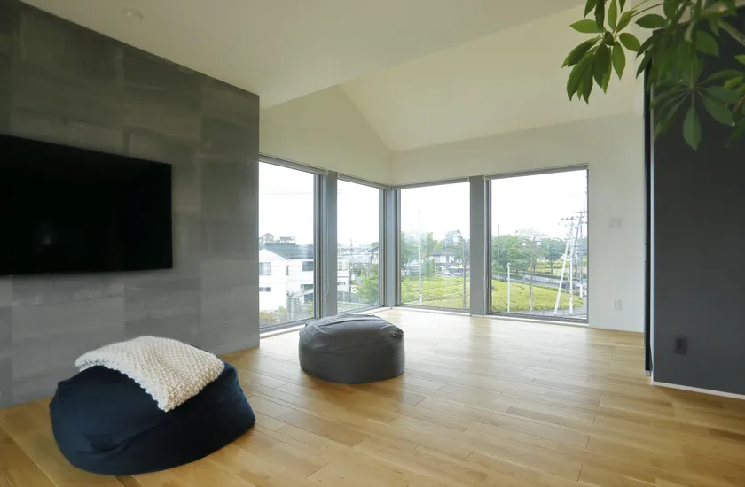 2階は、夫妻のくつろぎの場でありながら、ヨガ教室としても使えるよう、約44m2(約27畳)の仕切りのないLDKに。ソファなどの大きな家具を置いていないため、少し物を動かすだけで、プライベートなリビング空間からヨガのためのスペースに簡単に切り替えられるようにしました。また、眺めの良い西側を足元までの大きな窓にすることで、外の景色を楽しめる空間を実現しています。