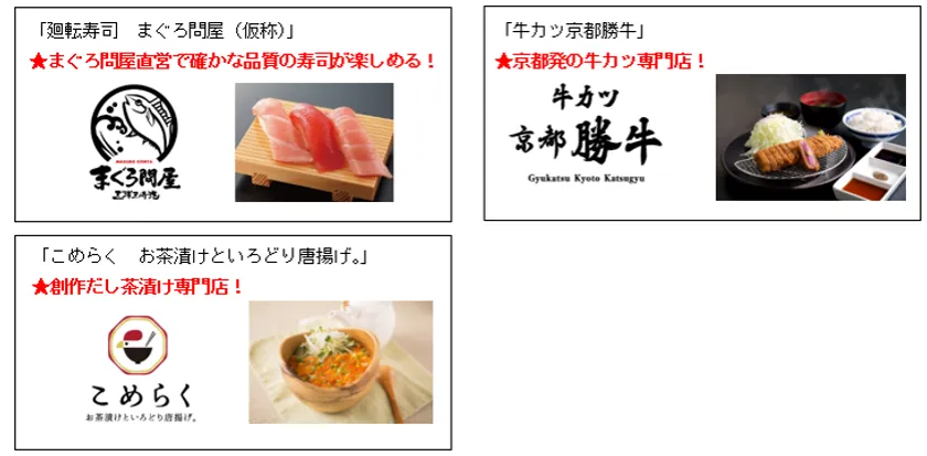 「廻転寿司 まぐろ問屋(仮称)」、「牛カツ京都勝牛」、「こめらく お茶漬けといろどり唐揚げ。」