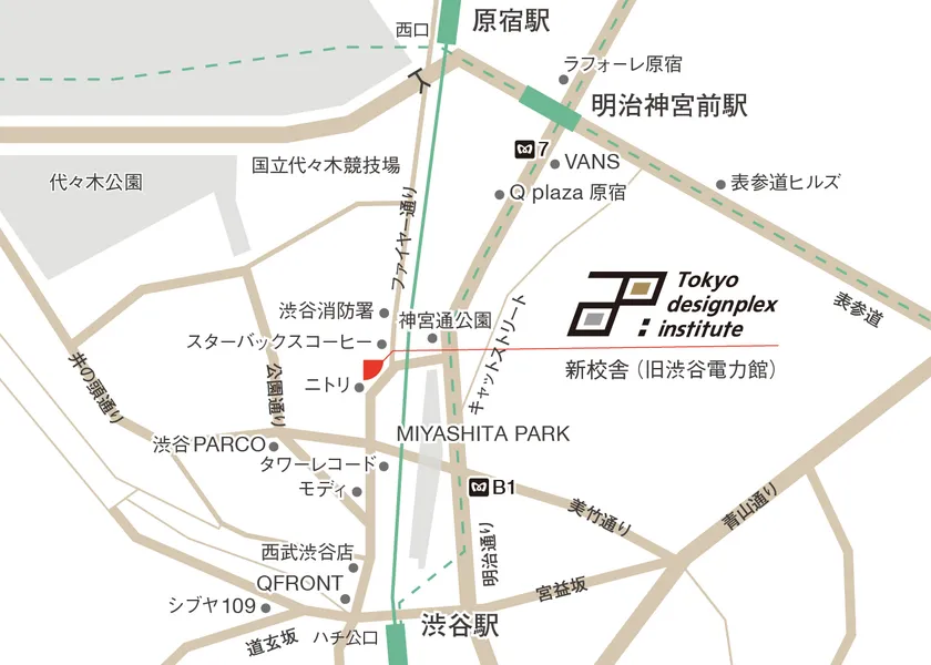 新校舎のある渋谷ファイヤー通りは、感度の高い若者に人気のストリートで、デザインを学ぶ環境に最適です。渋谷駅だけでなく原宿駅や明治神宮前駅からもアクセス可能となります。