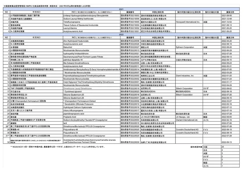 旧制度(2021年4月までの申請制度)では、過去10年間で承認された新原料は14件しかなく、新制度スタート以降、1年5ヶ月で38件の承認がされていることからもNMPAの積極的な取り組みがうかがえます。