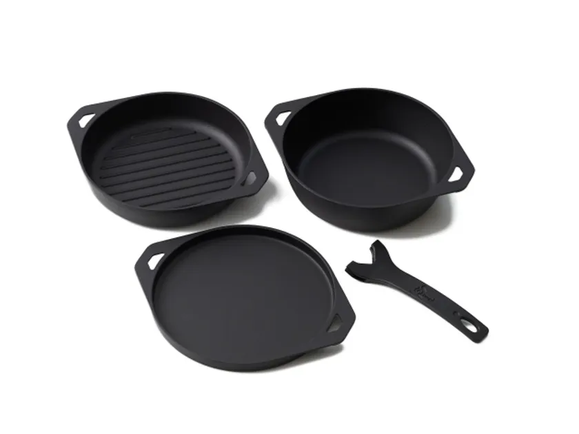 前回の4点セットは、浅型プレート、浅型グリル、深型スキレットの3点に全てに共通のハンドルがセットとなる4点セット。ハンドルは取り外し可能なため、調理中に熱くならないことも特徴の一つ。浅型プレートはもう2点のグリル、スキレットの蓋にもなり、蓋に炭をのせて調理するダッチオーブン的な使用方法も可能。いろいろな料理法が可能なこの商品でキャンプの料理の可能性がぐっと広がるアイテムです。